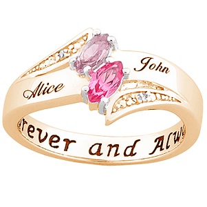 A sentiment of love and commitment is inscribed in Sterling Silver Jewelry with Gold overlay... "Forever and Always." This unique promise design is personalized with your names and marquise-cut Austrian crystal birthstones with genuine Diamond accents. Choose 2 names, up to 10 letters each, and corresponding birthstones. Available in full sizes 5 thru 12.